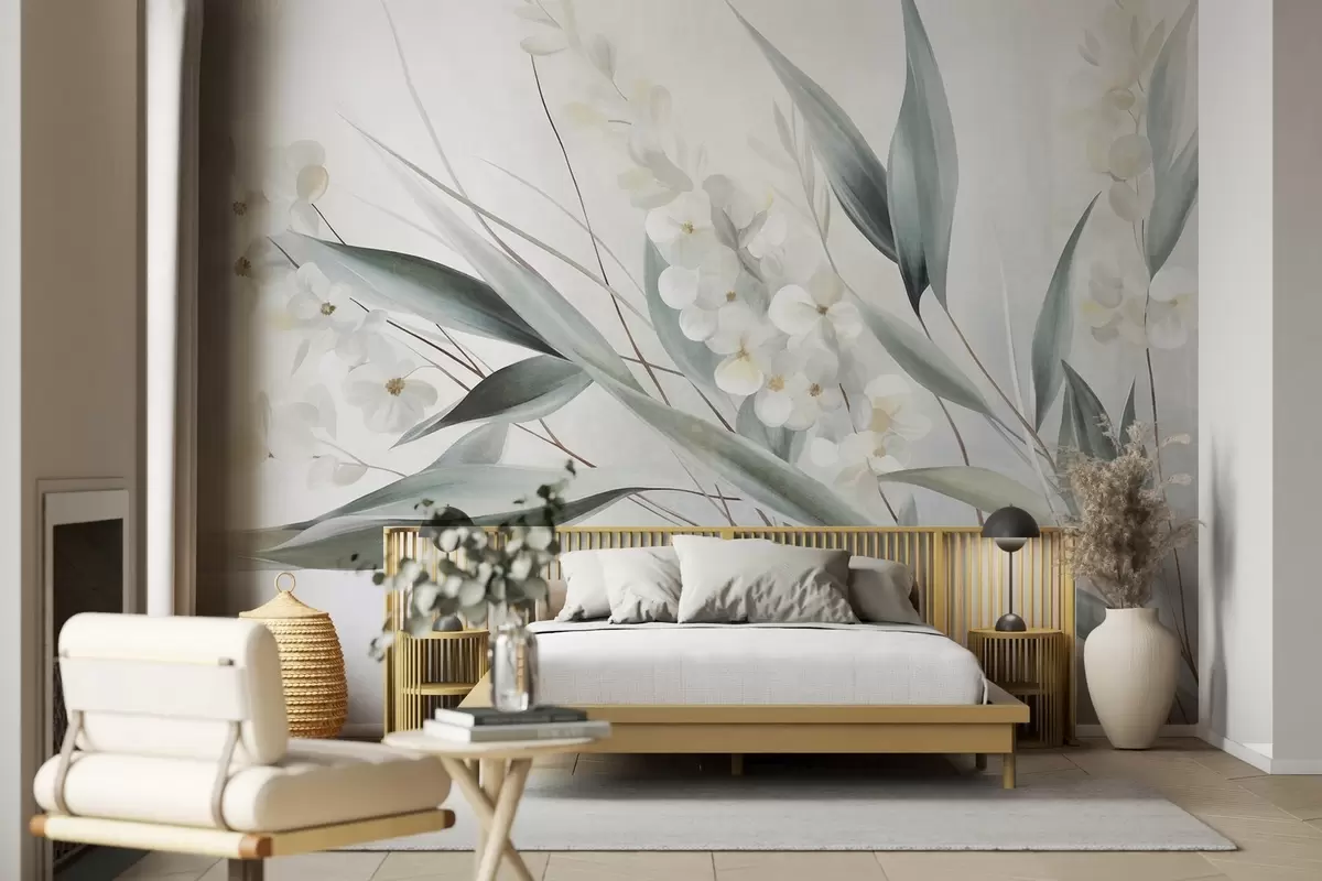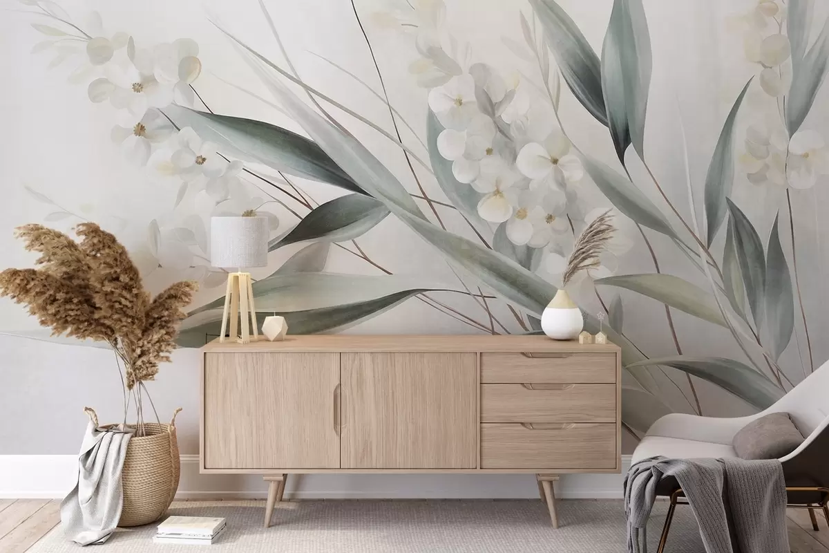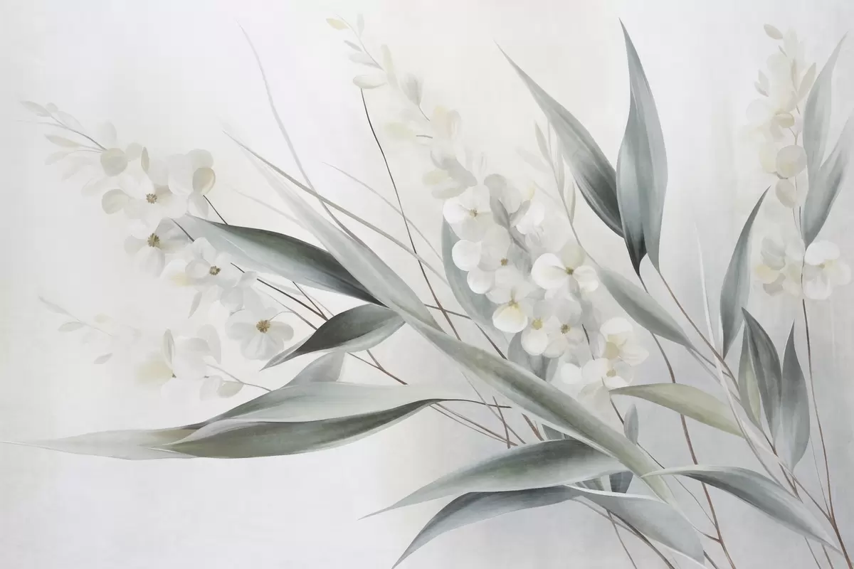 Fototapet Flori delicate și frunze verzi lungi, redate într-un stil pictural cu tușe subtile, artă texturată Nr. w09827