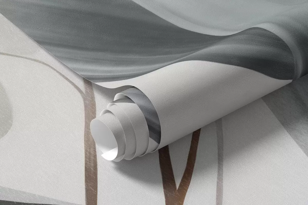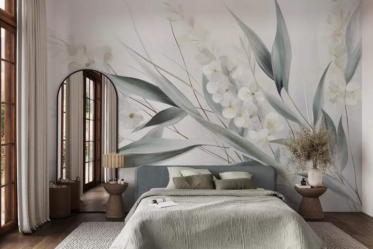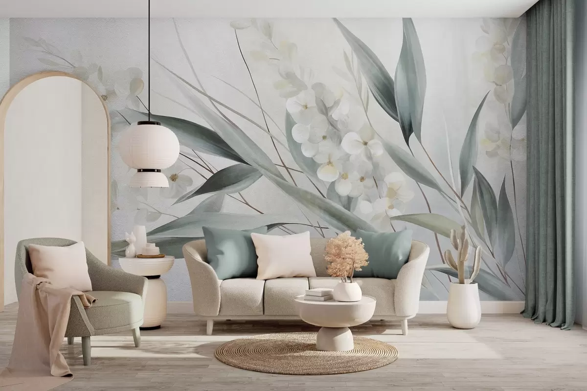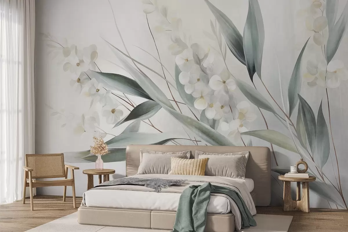 Fototapet Flori delicate și frunze verzi lungi, redate într-un stil pictural cu tușe subtile, artă texturată Nr. w09827