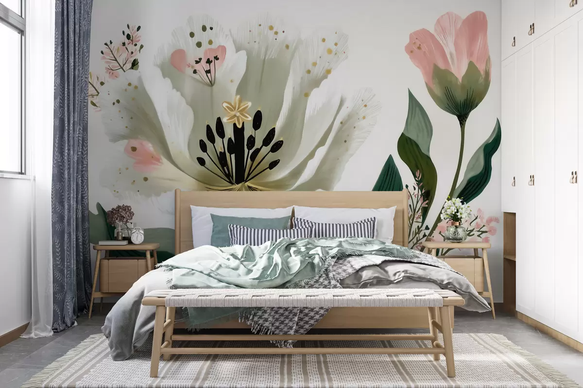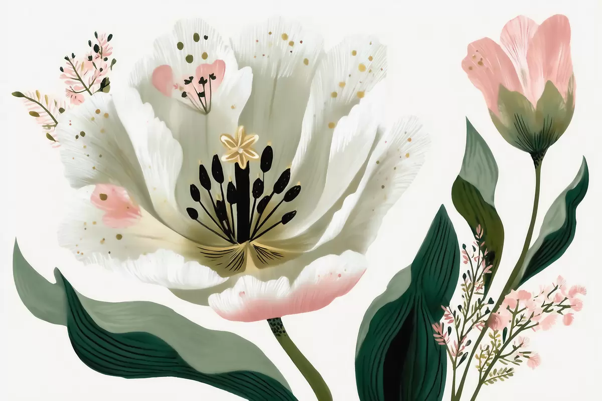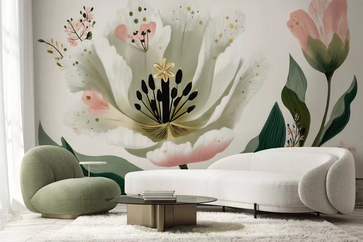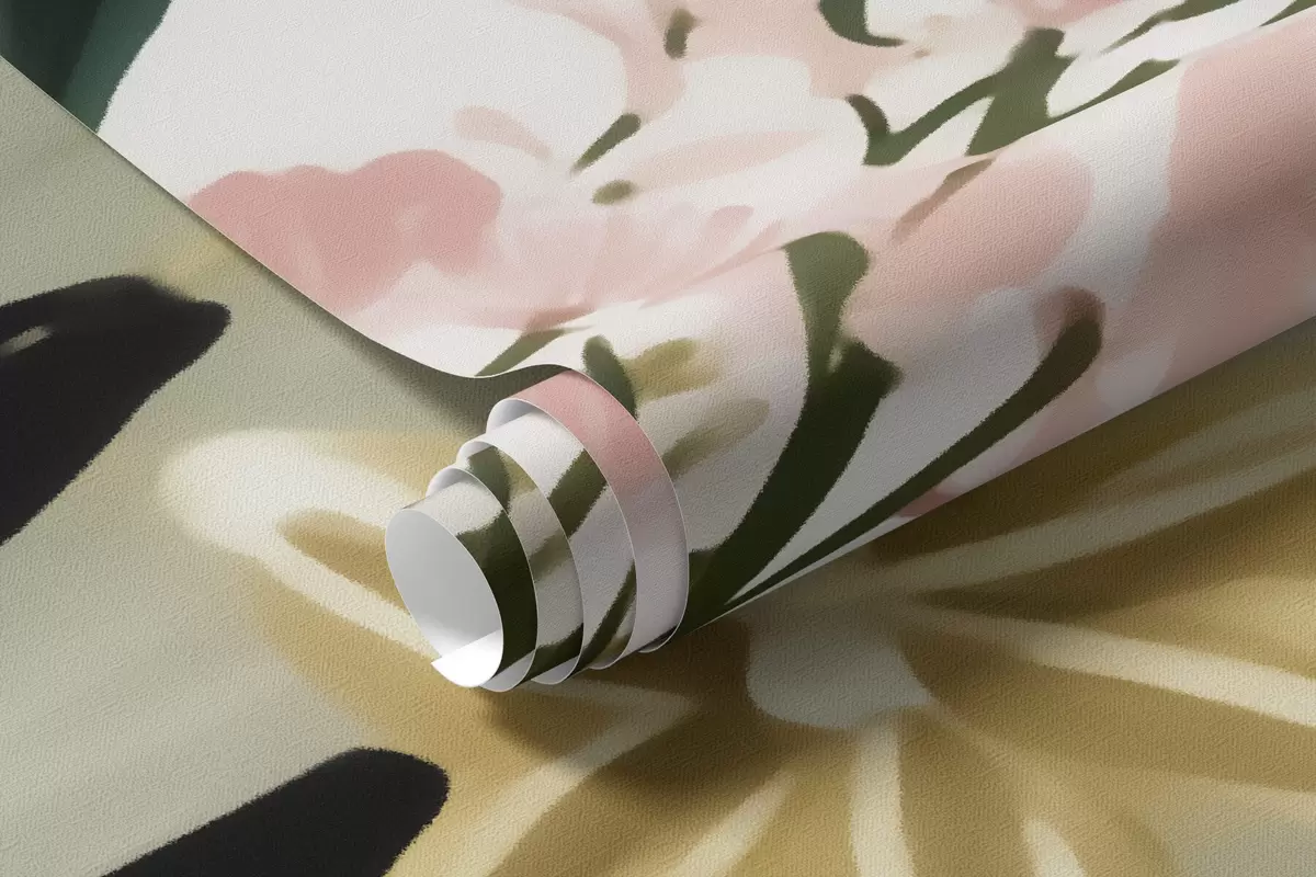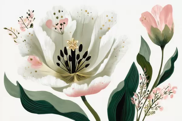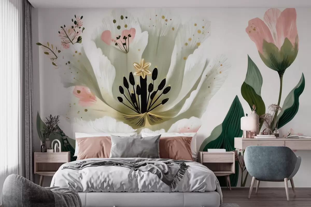 Fototapet O floare cu frunze verzi și accente de roz pal, în stil acuarelă Nr. w09836