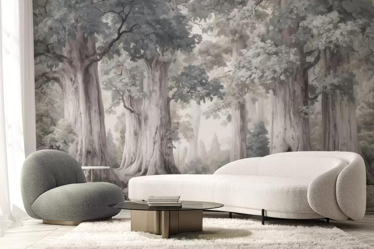 Fototapet O pădure de basm, cu copaci înalți și o paletă de culori delicate, în stil acuarelă Nr. w09849