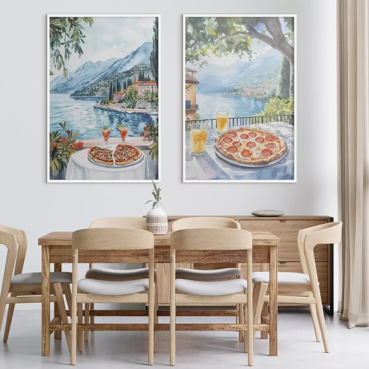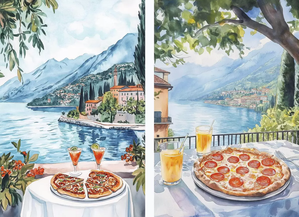 Poster Lacul Como, brunch în Italia, stil acuarelă, pizza margarita, natura verii d00406