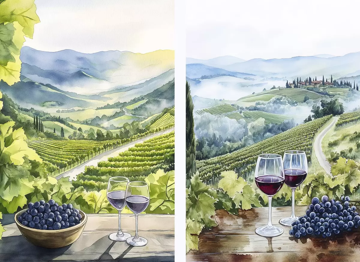 Poster Peisaje frumoase din Toscana, curți de struguri, pahare de vin, stil acuarelă, Italia d00408