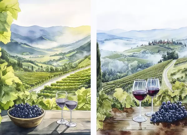 Poster Peisaje frumoase din Toscana, curți de struguri, pahare de vin, stil acuarelă, Italia Nr d00408