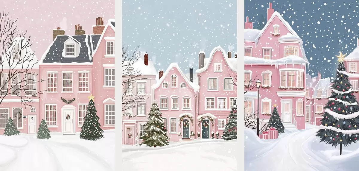 Poster Frumos oraș de iarnă cu case roz, copaci de pin, fulgi de zăpadă d00410