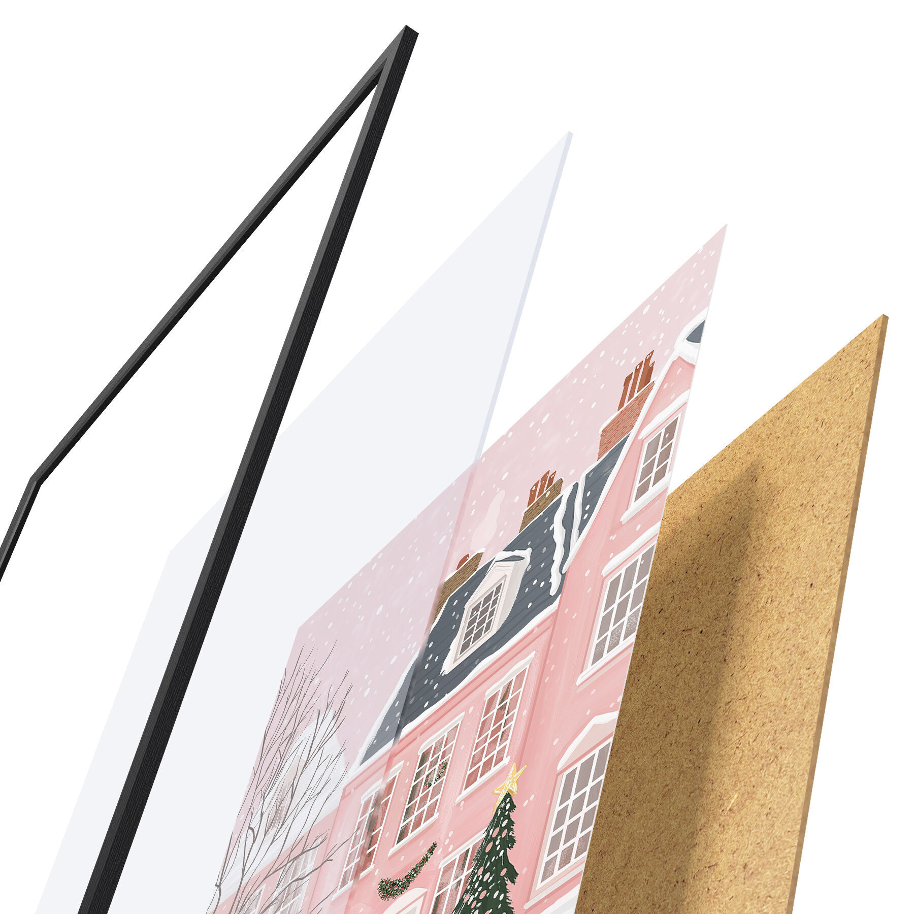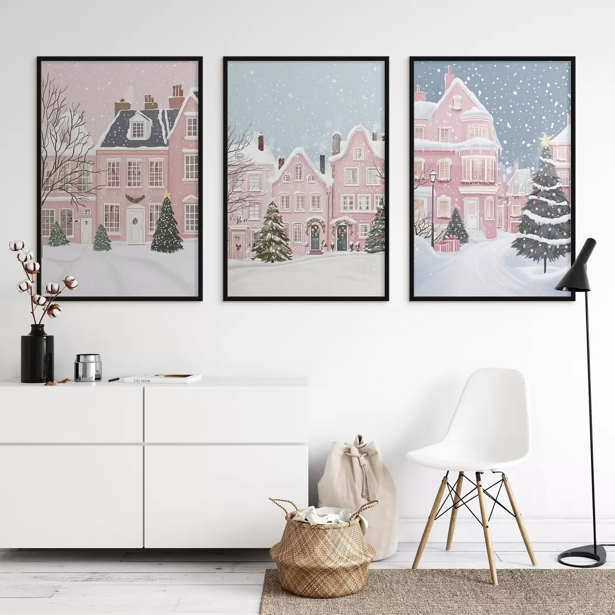 Poster Frumos oraș de iarnă cu case roz, copaci de pin, fulgi de zăpadă Nr d00410