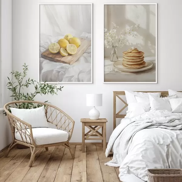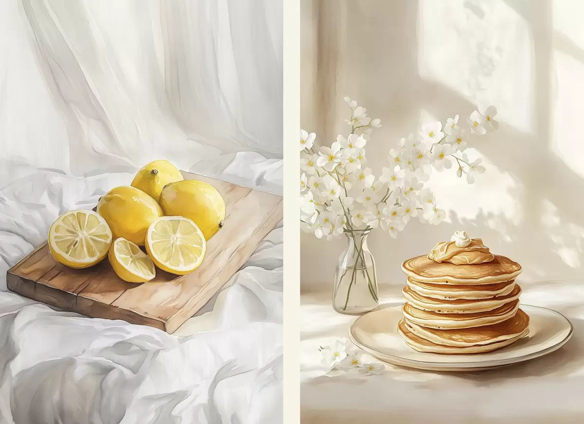 Poster Clătite cu unt de arahide, lămâi pe placa de lemn, stil acuarelă Nr d00416