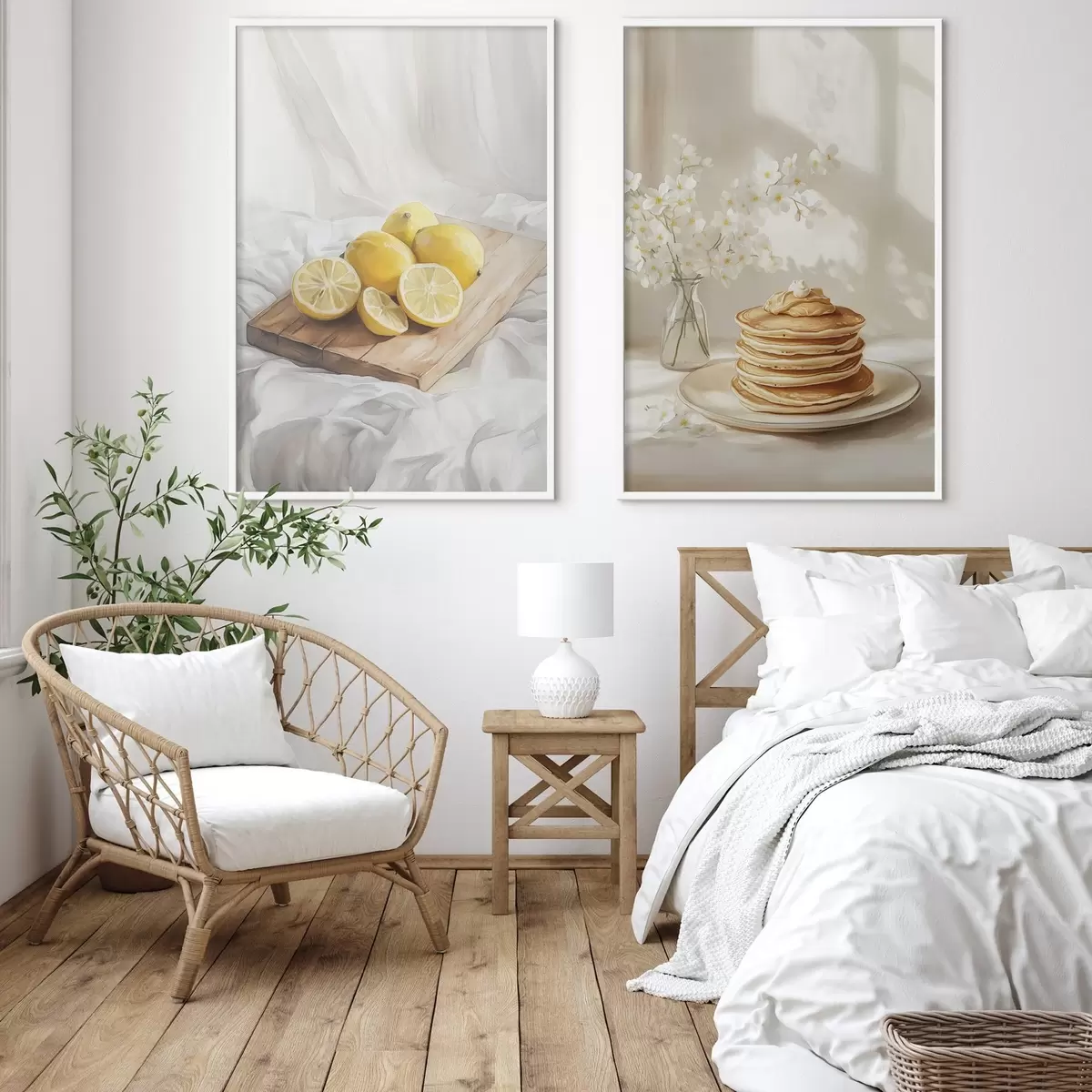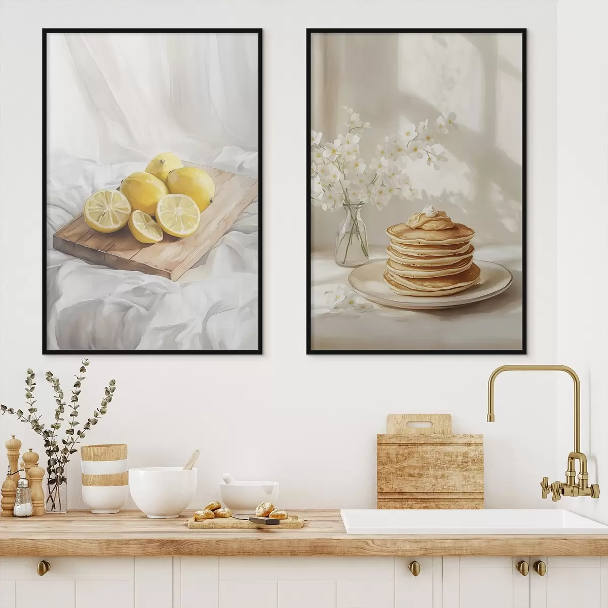 Poster Clătite cu unt de arahide, lămâi pe placa de lemn, stil acuarelă d00416