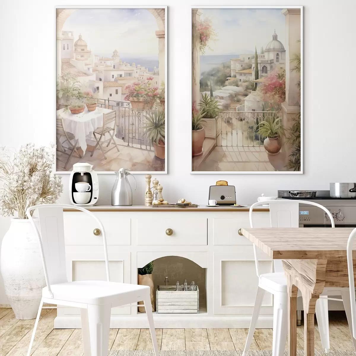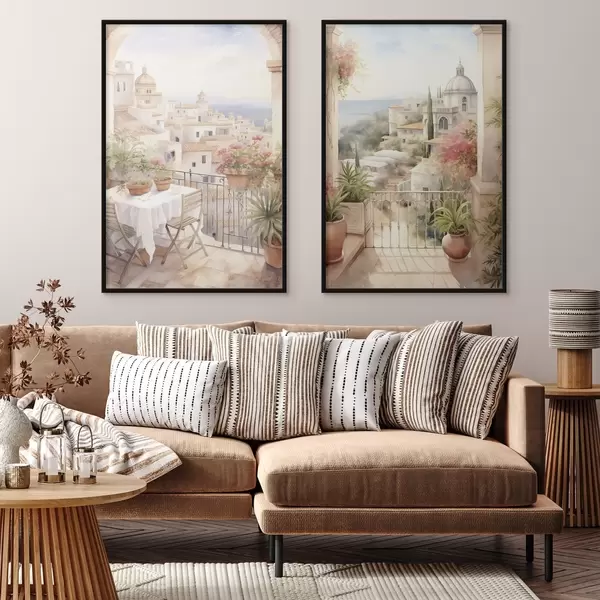 Poster Apus de soare pe balcon, arhitectura, flori înflorite, stil acuarelă, mediteranean Nr d00420