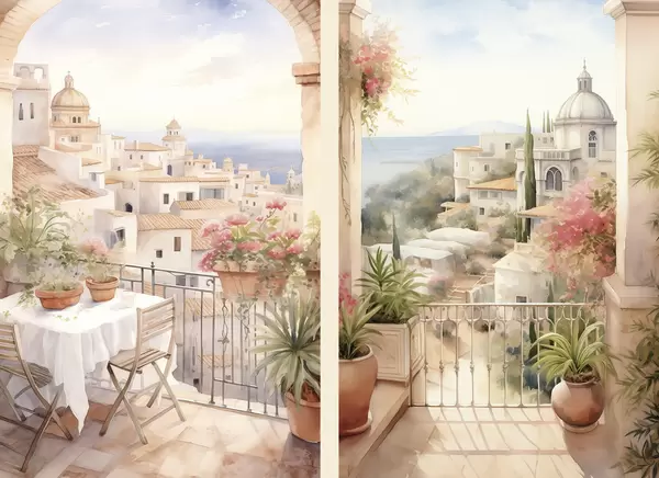 Poster Apus de soare pe balcon, arhitectura, flori înflorite, stil acuarelă, mediteranean Nr d00420