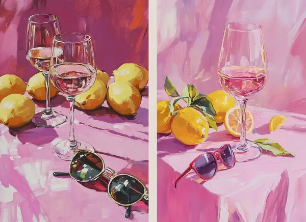 Poster Abstracție în stil ulei cu pahare de șampanie, lămâi și ochelari de soare, culori roz Nr d00444