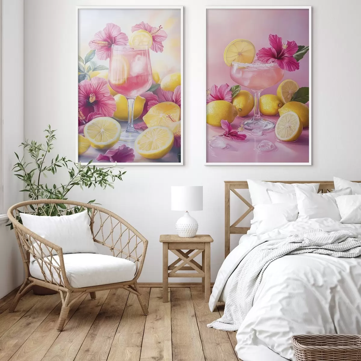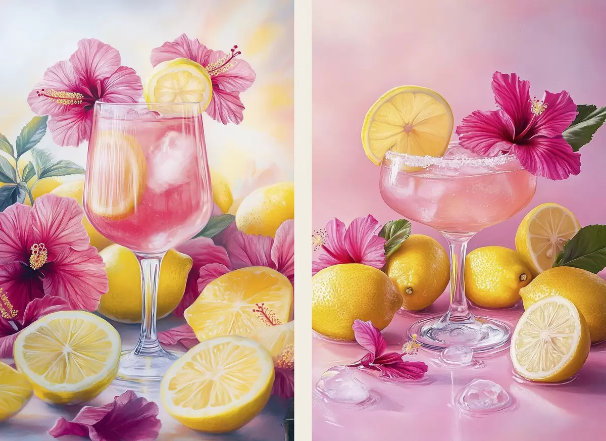 Poster Cocteiluri cu flori de hibiscus și lămâi, vară, suculent, stil acuarelă d00446