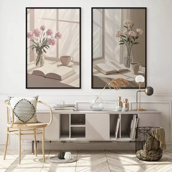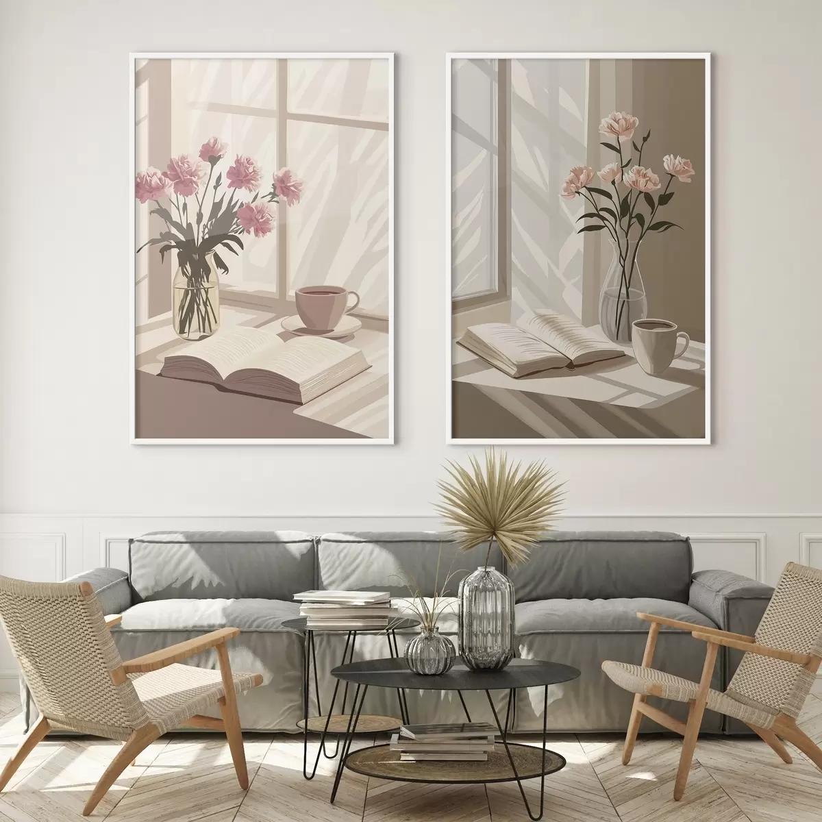 Poster Abstracție, estetica dimineții, ceașcă de cafea, carte, flori Nr d00448