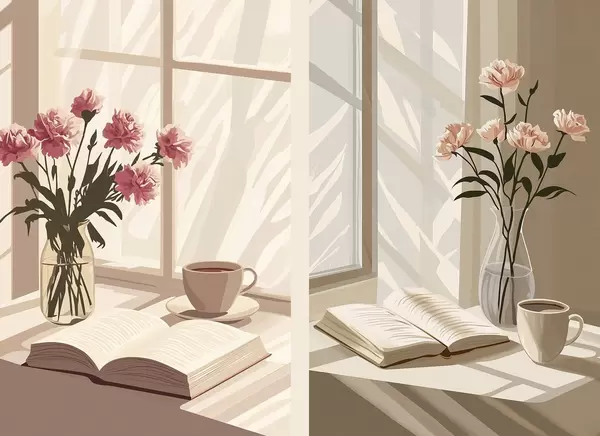 Poster Abstracție, estetica dimineții, ceașcă de cafea, carte, flori Nr d00448