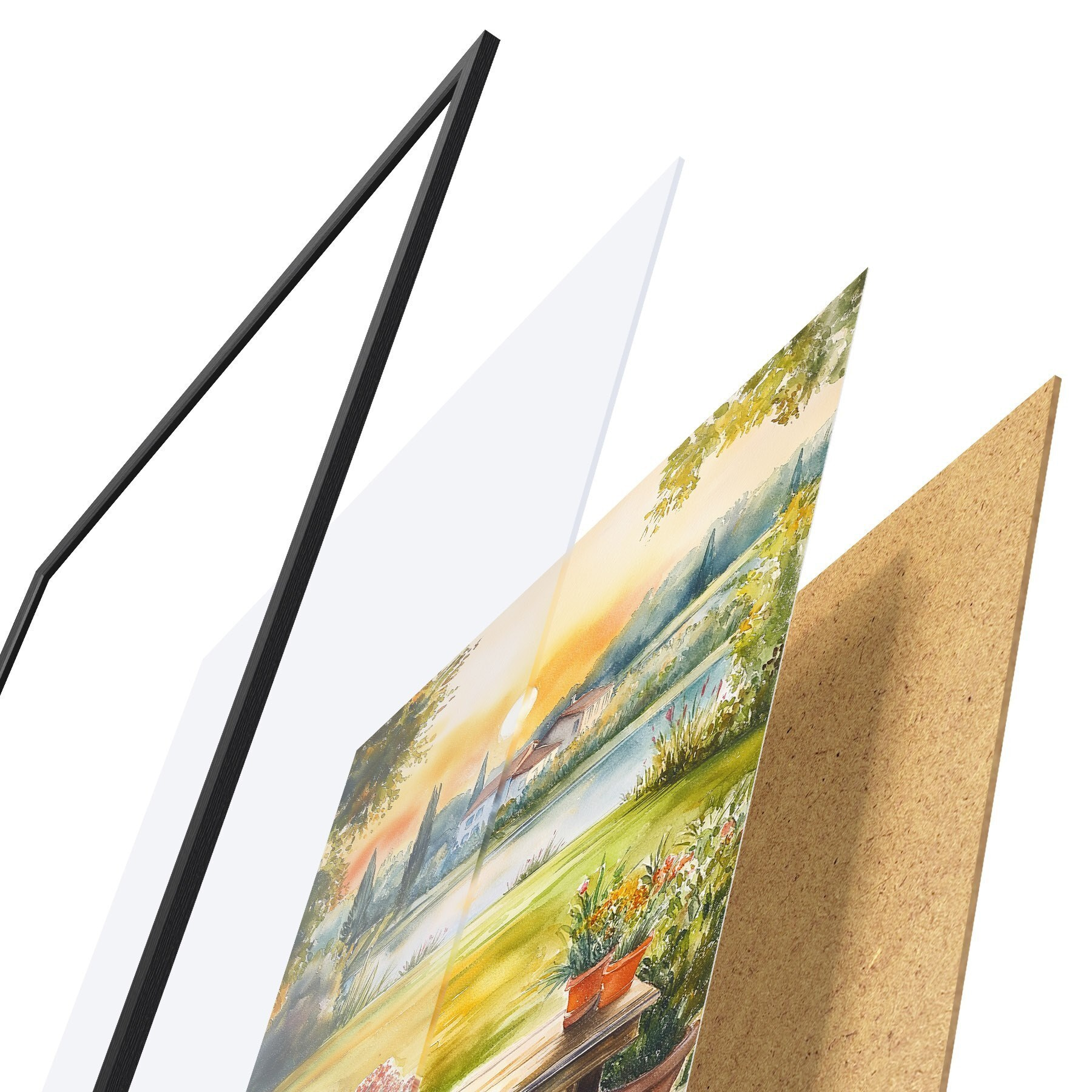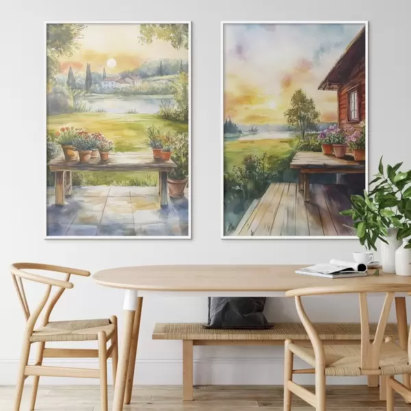 Poster Sat de vară, apus de soare, rustic, flori, lac, stil acuarelă d00449