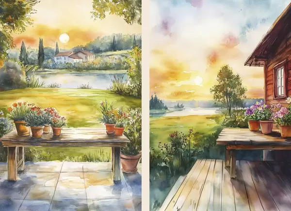 Poster Sat de vară, apus de soare, rustic, flori, lac, stil acuarelă d00449