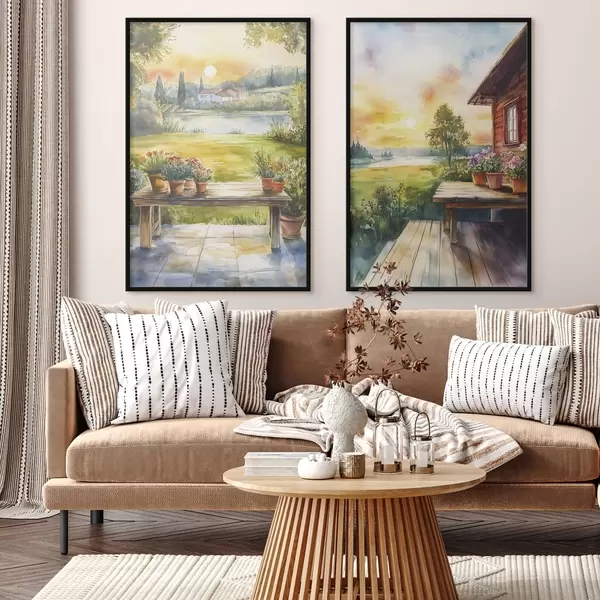 Poster Sat de vară, apus de soare, rustic, flori, lac, stil acuarelă Nr d00449