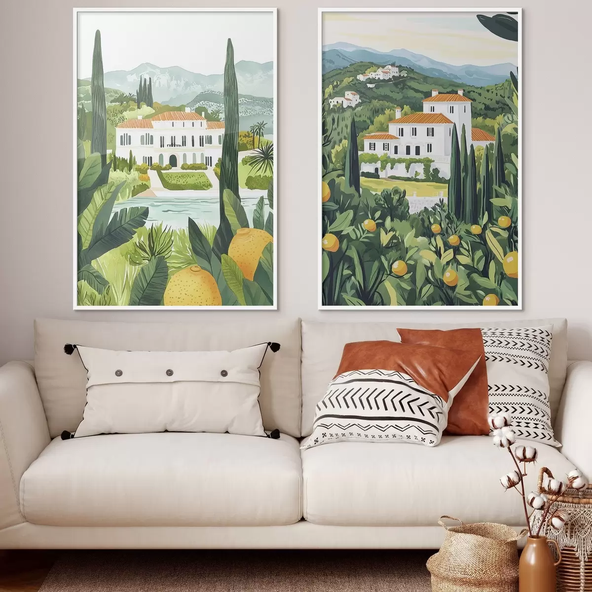 Poster Peisaje mediteraneene cu copaci și case, coasta mării, Spania d00450