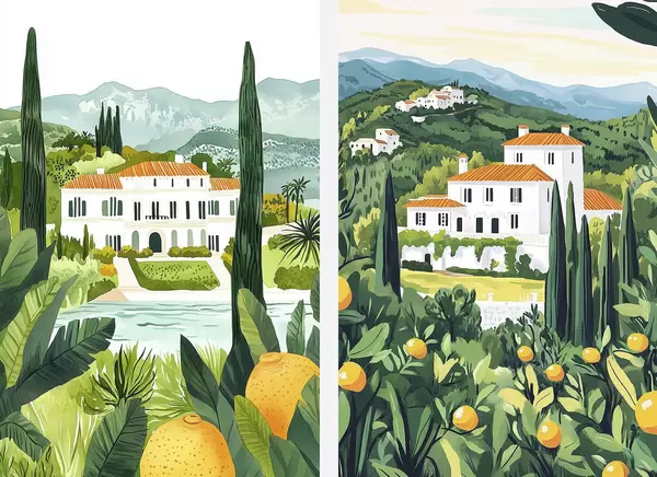 Poster Peisaje mediteraneene cu copaci și case, coasta mării, Spania d00450