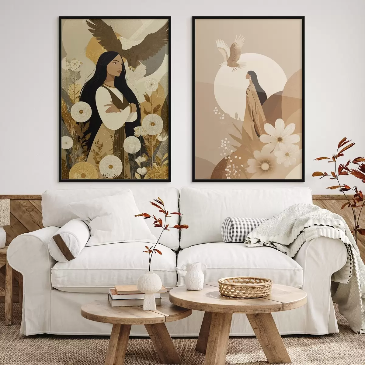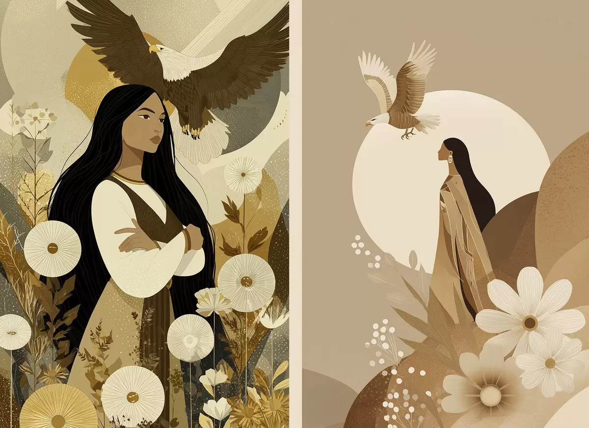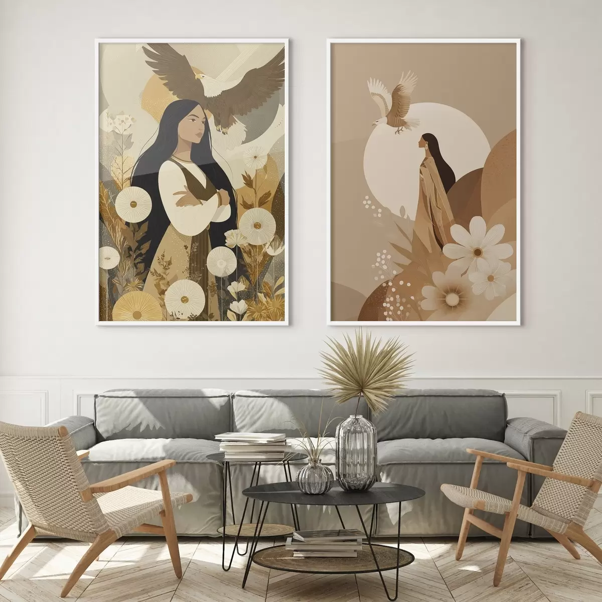 Poster Femei cu vulturi zburători, stil tribal, culori bej d00477