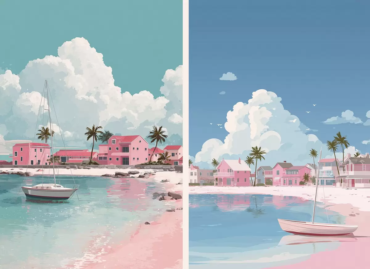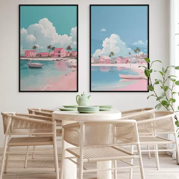 Poster Plajă de vară roz cu soare, barcă cu pânze și case Nr d00479