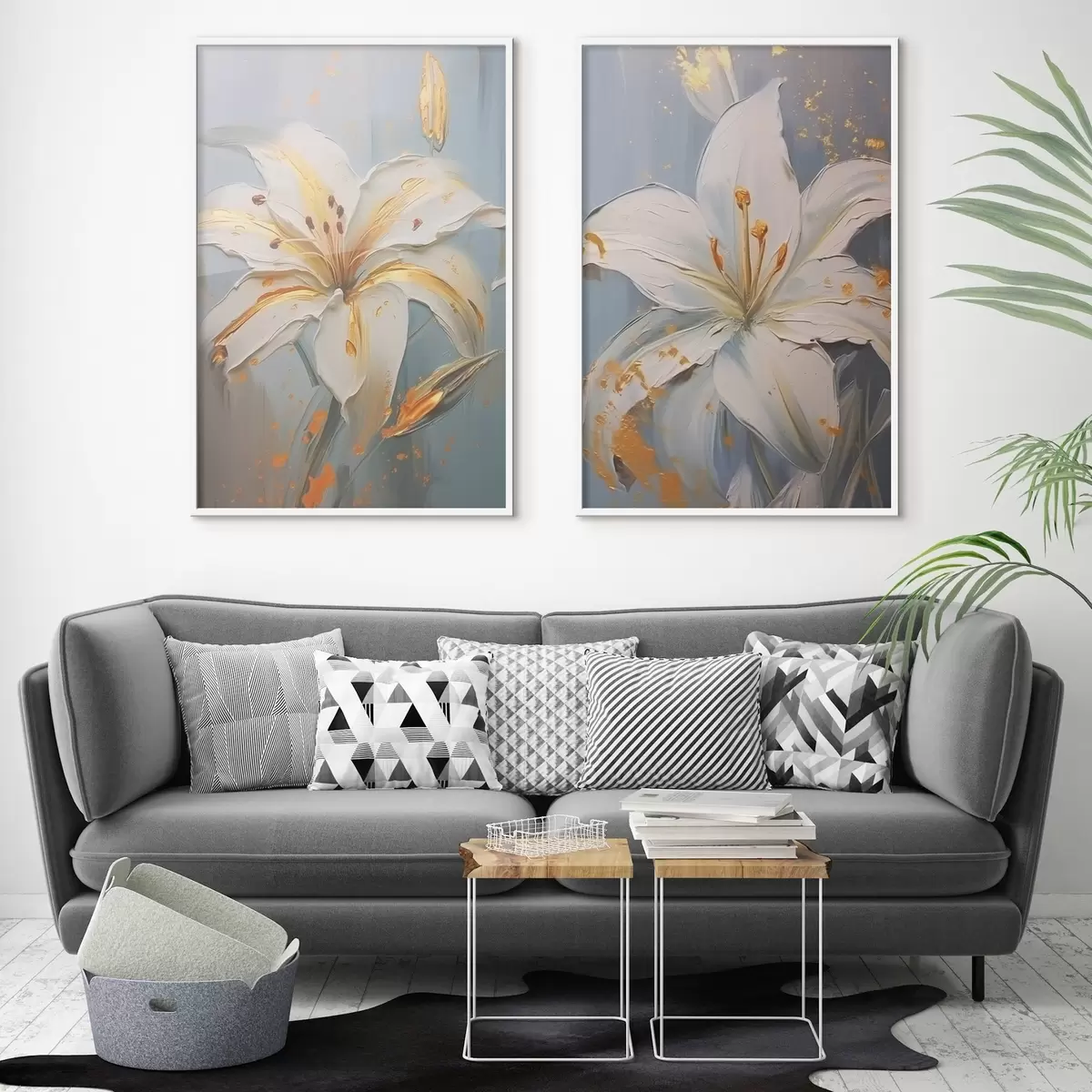 Poster Crini albi cu stropi galbeni pe un fundal albastru Nr d00497