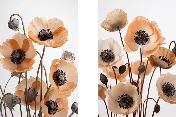 Poster Mac portocaliu, flori uscate pe un fundal deschis, iluminare moale, petale delicate, aranjament floral Nr d00518
