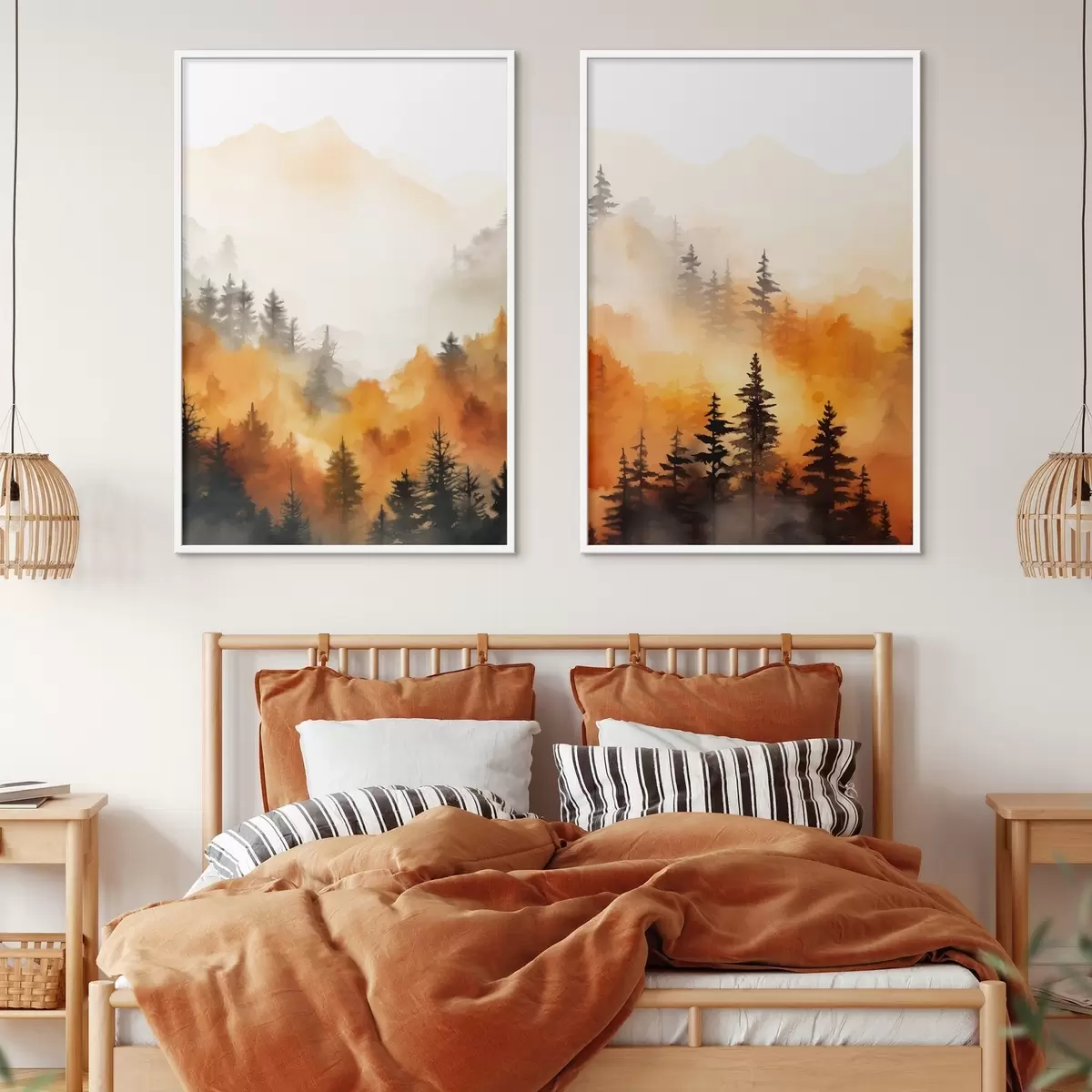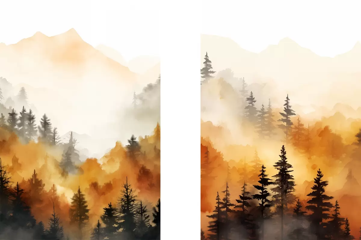 Poster O imitație de pictură peisaj acuarelă a unei păduri cu pini înalți și munți în fundal Nr d00519