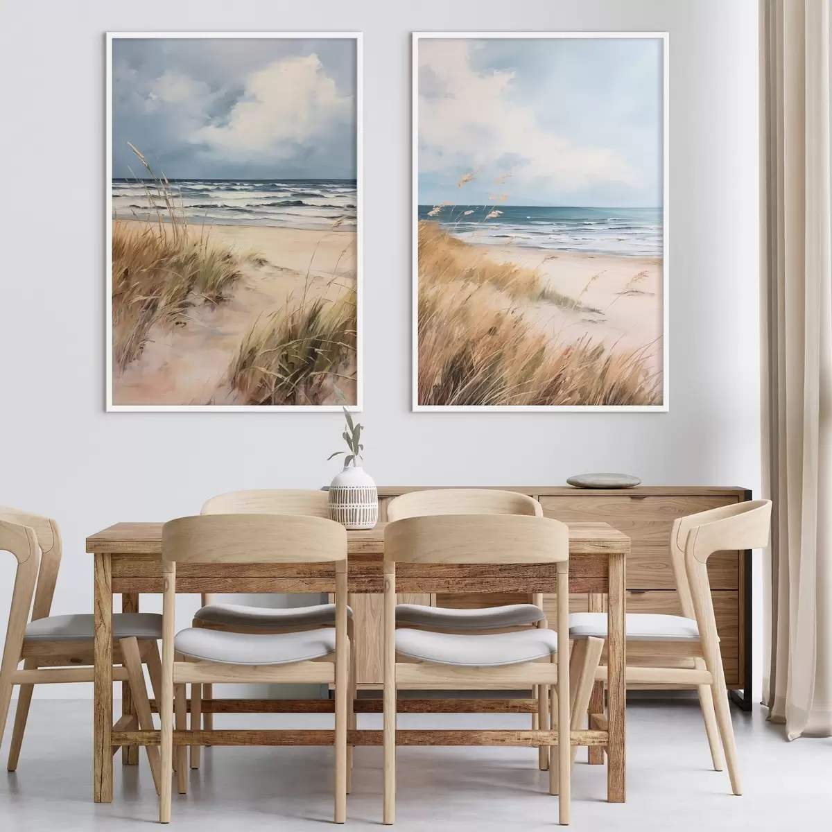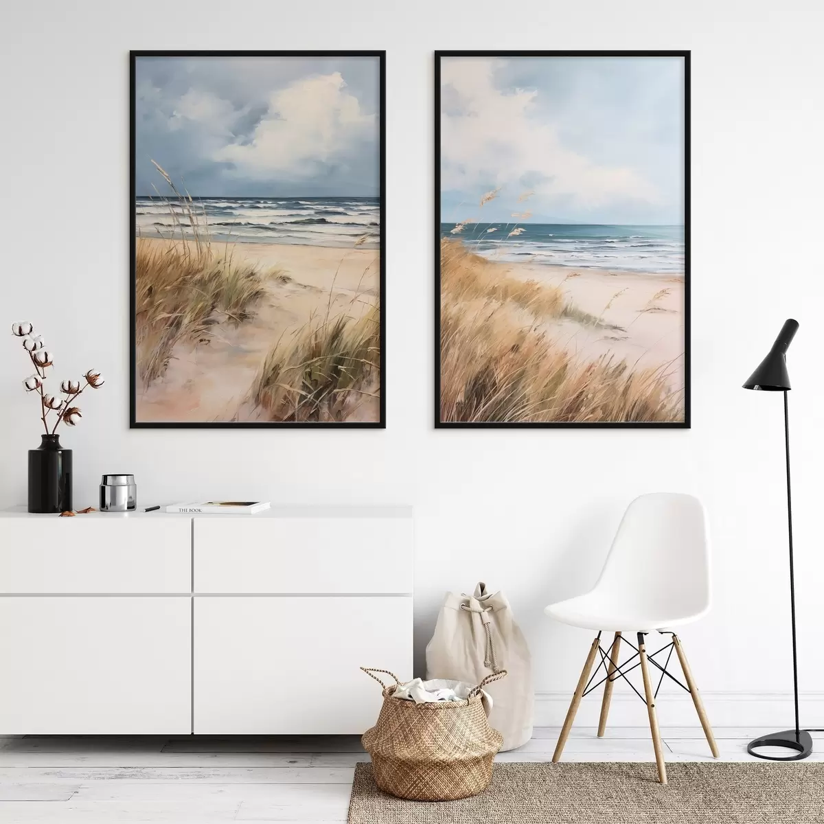 Poster O plajă nisipoasă cu iarbă înaltă în prim-plan, oceanul cu valuri și un cer înnorat în fundal Nr d00521