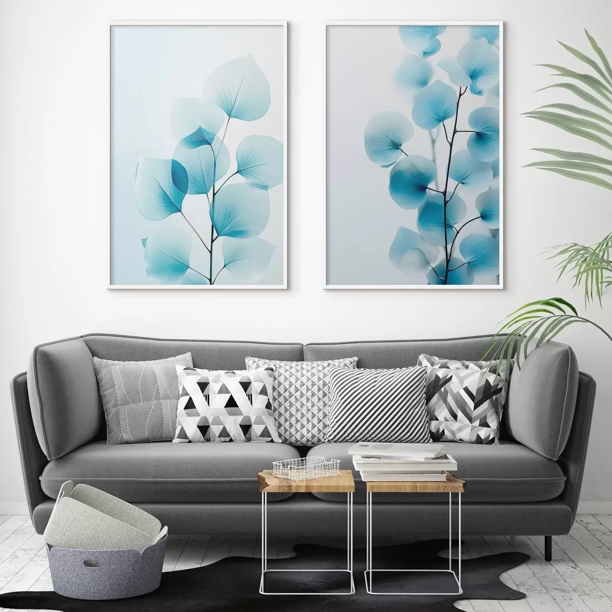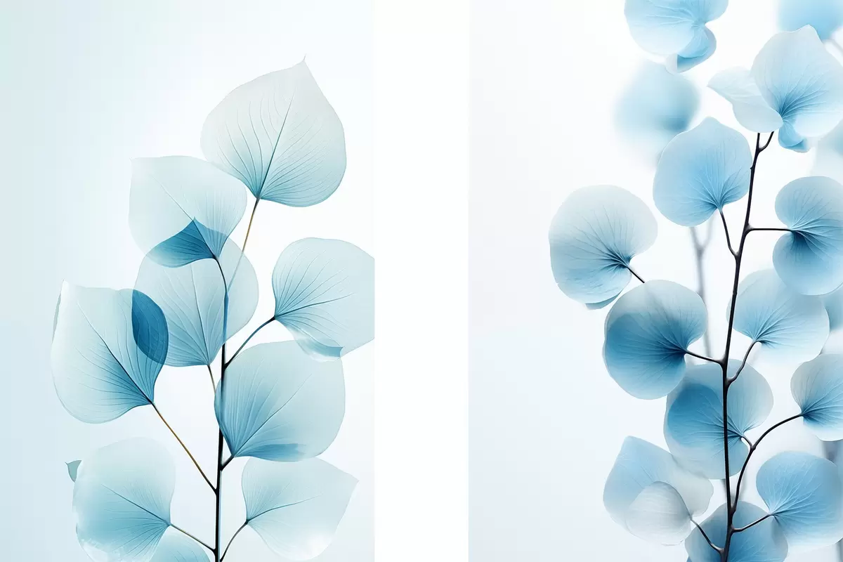 Poster Creangă cu frunze albastre translucide, vene delicate vizibile, compoziție ușoară și calmă, estetică minimalistă Nr d00522