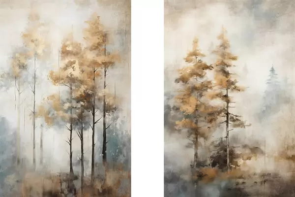Poster Copaci înalți texturați cu frunze galbene într-o pădure, fundalul este un amestec de tonuri moi de albastru și maro Nr d00528