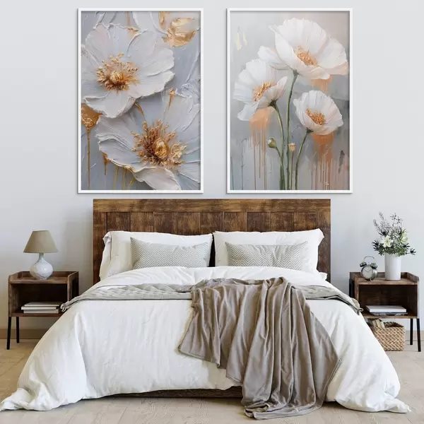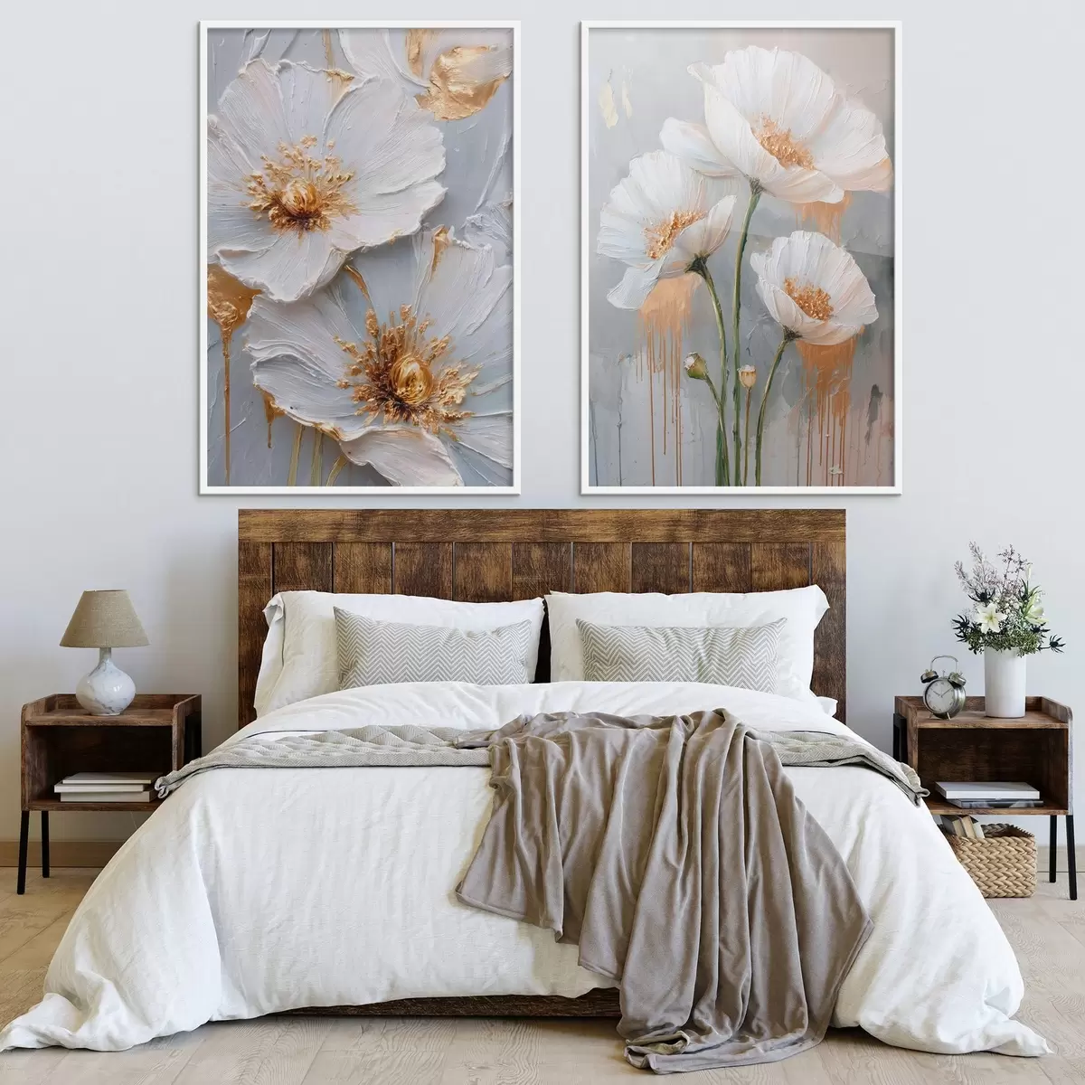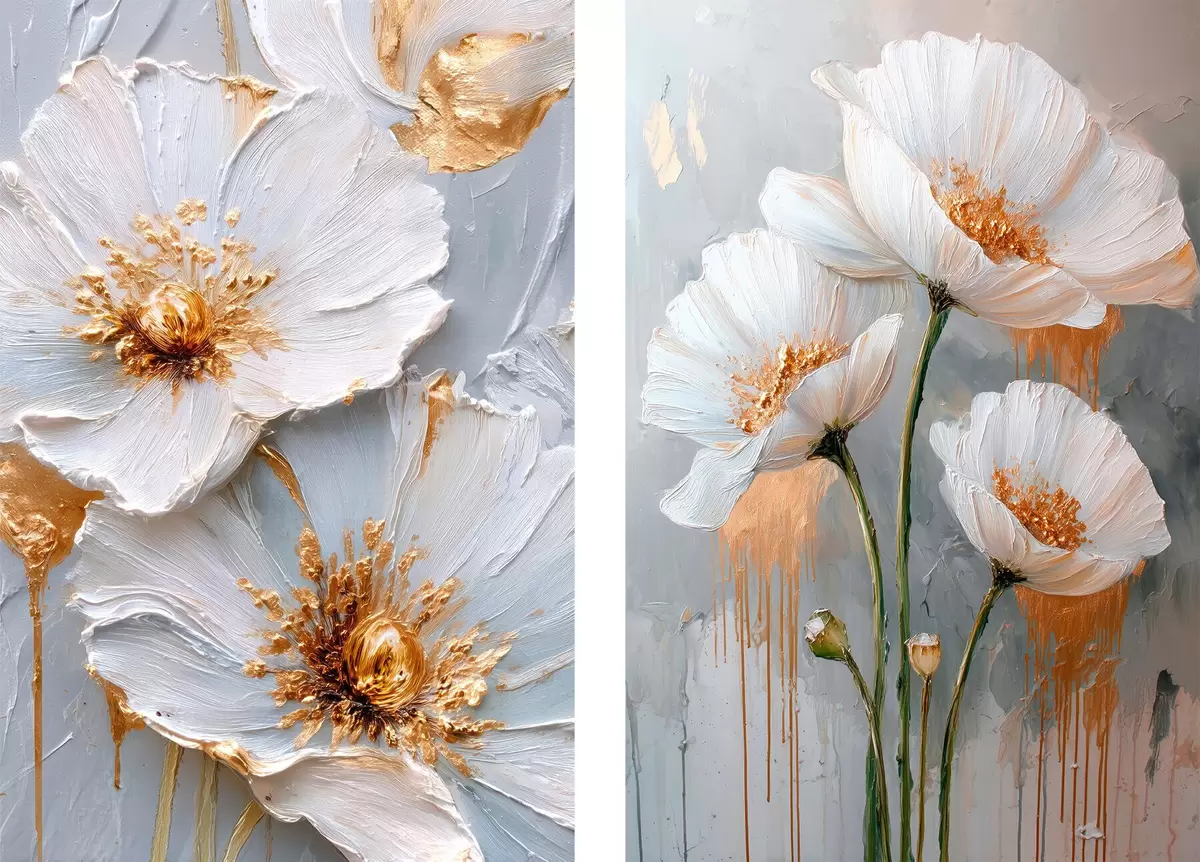 Poster Pictură volumetrică de flori albe cu accente aurii pe un fundal gri Nr d00568