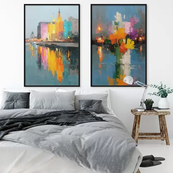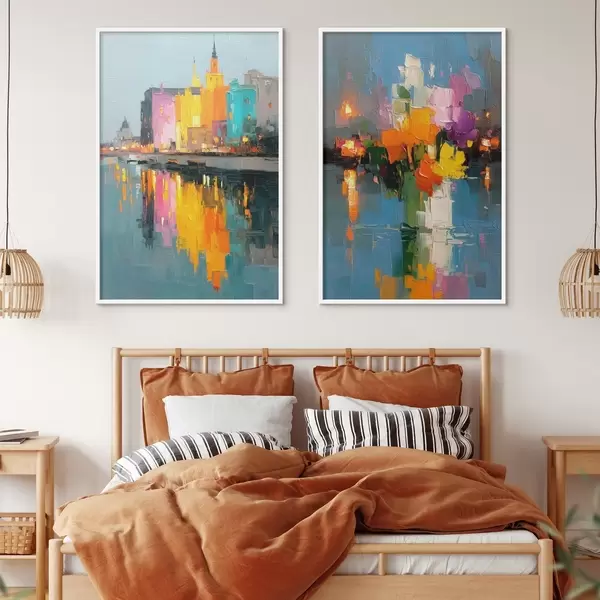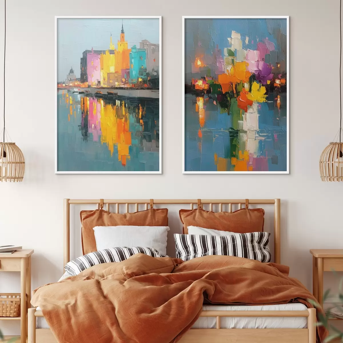Poster Dinamica orașului: compoziție abstractă cu reflexii de lumini pe râu Nr d00569
