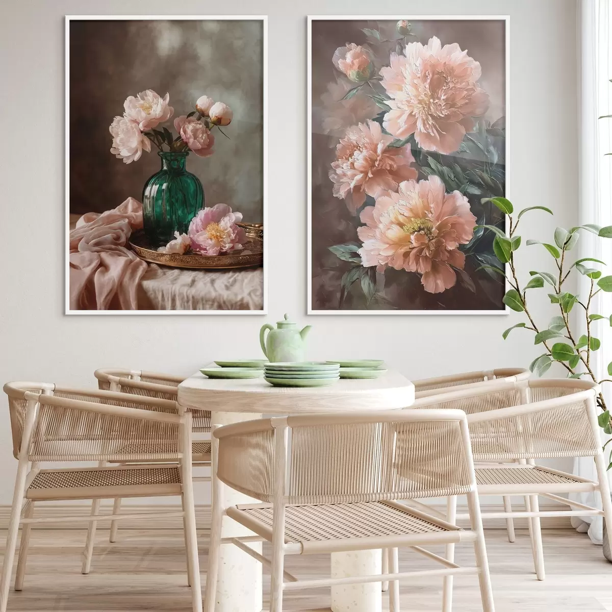 Poster Compoziție împerecheată cu bujori roz într-o vază și pe pânză Nr d00578