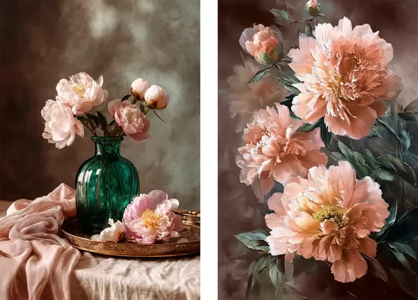 Poster Compoziție împerecheată cu bujori roz într-o vază și pe pânză d00578