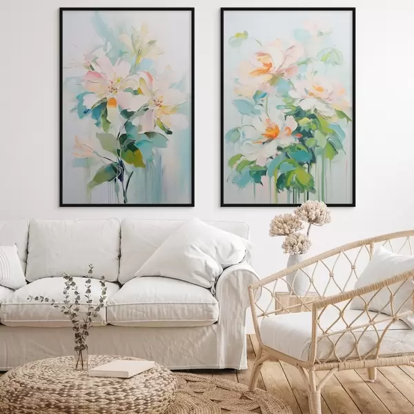 Poster Flori de piersici albe și pastelate, frunze verzi, imitație de pictură în ulei cu tușe moi, fundal albastru deschis Nr d00644