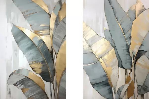 Poster Un set de frunze de banane albastre, gri și galbene cu tușe de pensulă vizibile, pe un fundal abstract alb Nr d00645