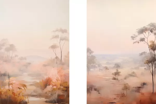 Poster Un peisaj cu tufișuri și copaci în nuanțe de roz , portocaliu , și maro , cu munți în fundal Nr d00646