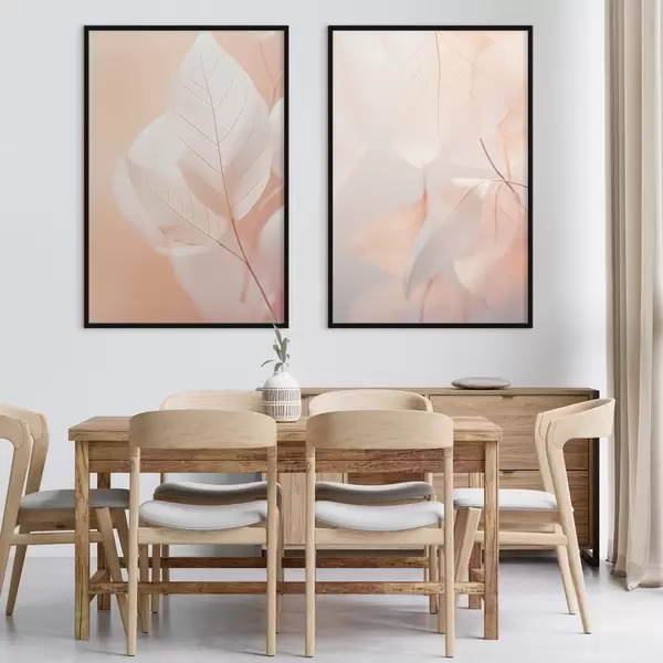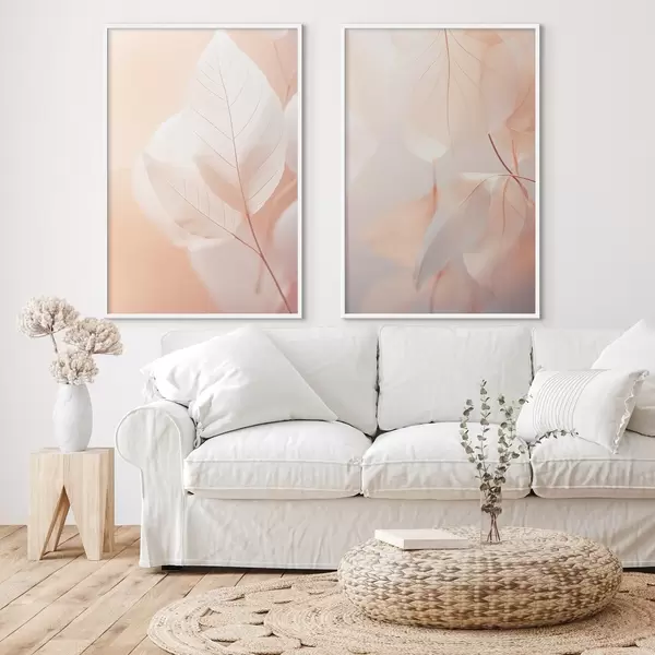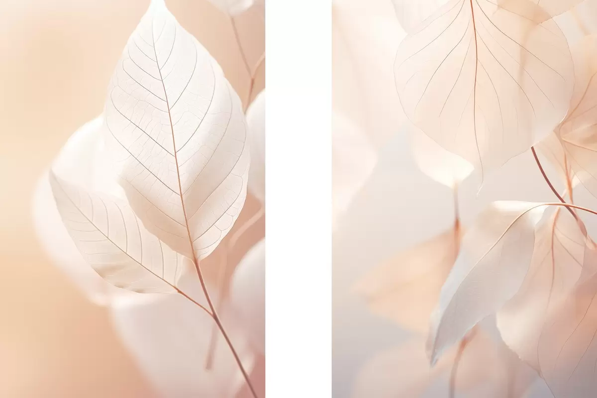 Poster Close-up de frunze translucide cu vene delicate, paleta de culori piersică moale și alb, fundal neclar Nr d00647