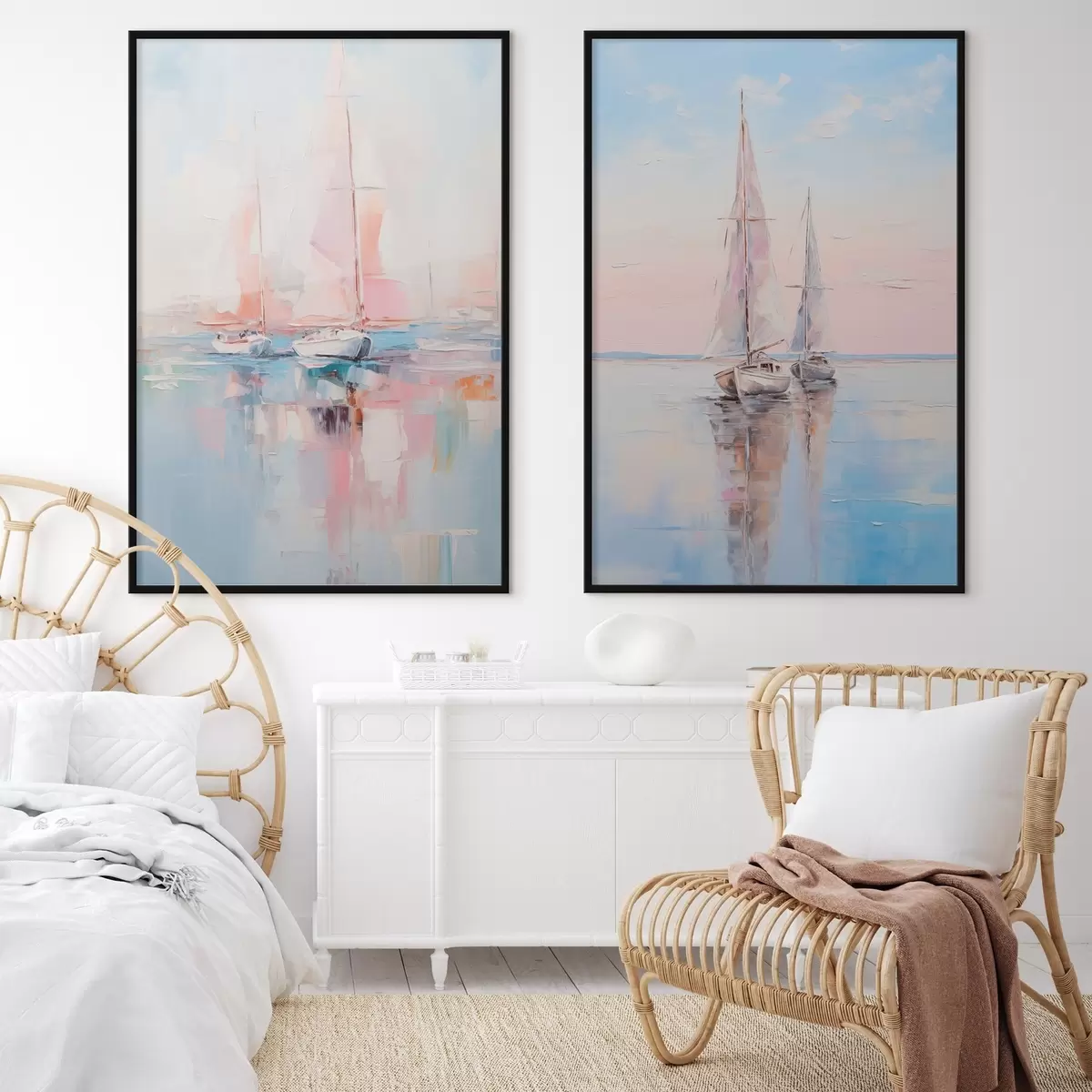Poster Bărci cu vele roz plutind pe o mare calmă, reflecții ale bărcilor în apă, culori pastelate moi d00648