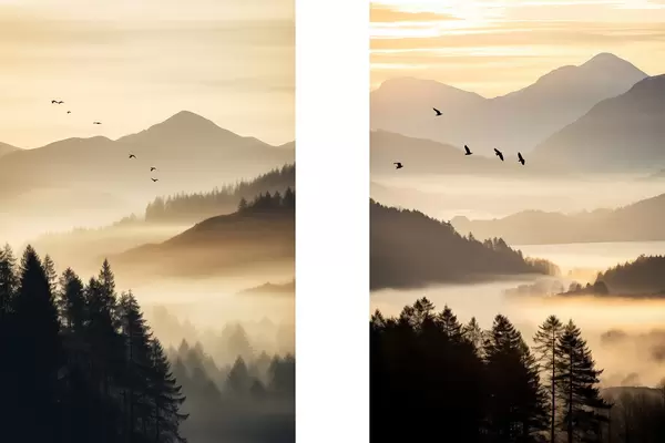 Poster Un peisaj montan cu o pădure și păsări care zboară pe cer , toate acoperite de un strat gros de ceață în timpul răsăritului d00651