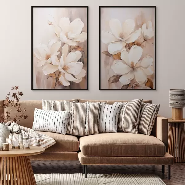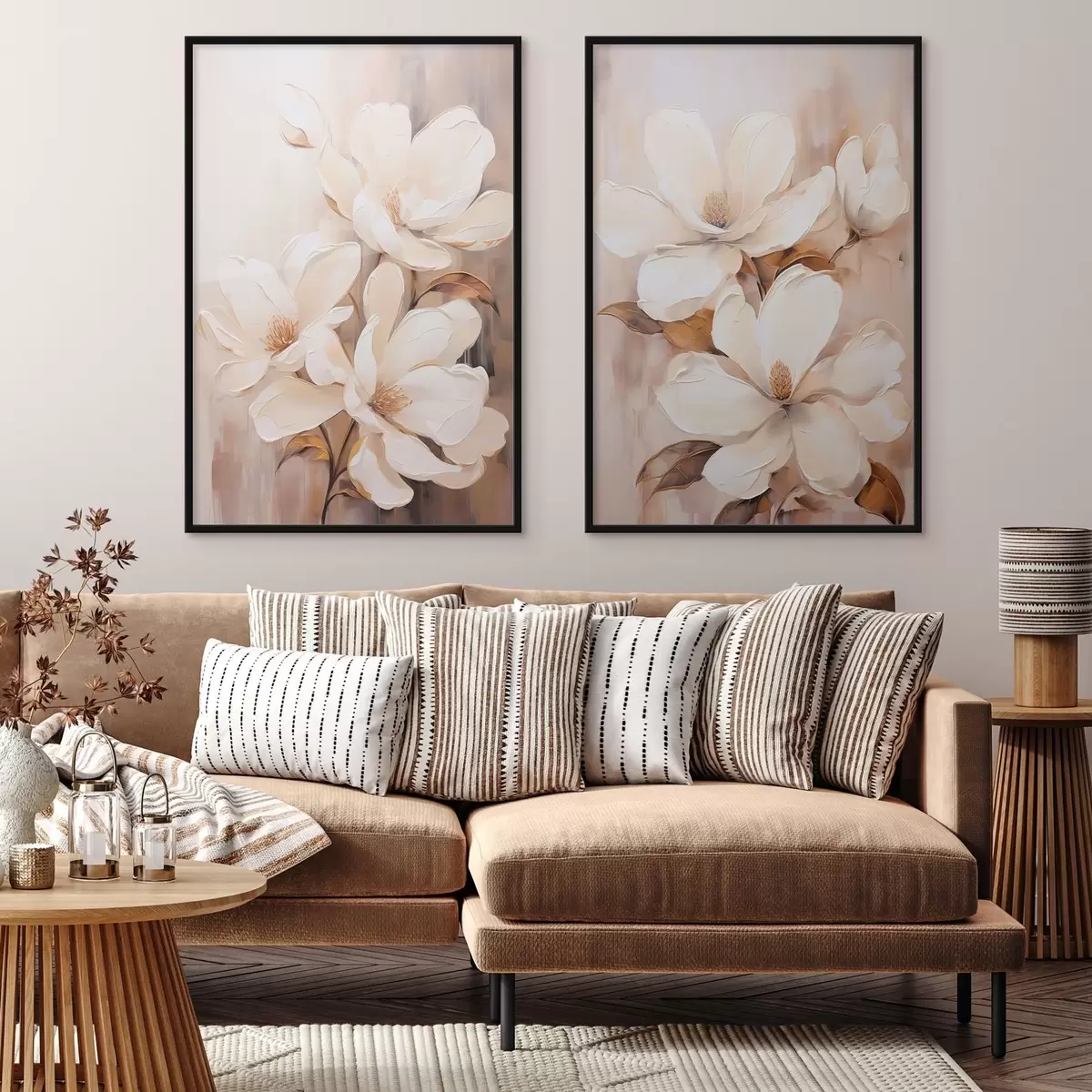 Poster Flori albe de magnolie pe un fundal blând, neclar, cu tonuri de bej și maro, stil pictură Nr d00655