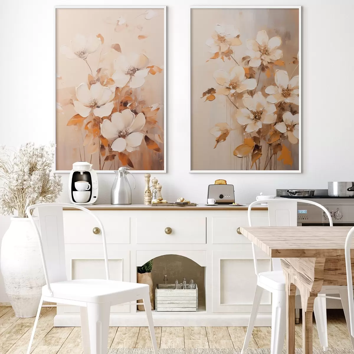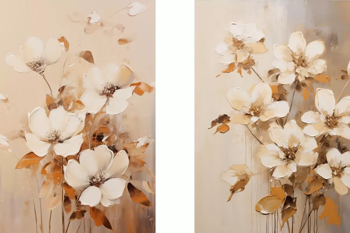 Poster Flori albe cu frunze portocalii, tușe delicate, paletă de culori calde, compoziție elegantă d00656