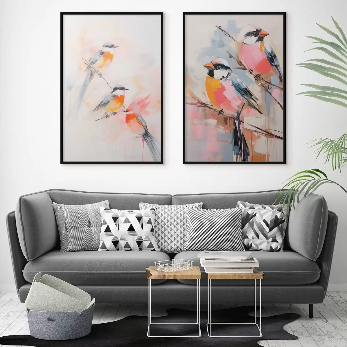 Poster Păsări cocoțate pe ramuri, culori pastelate moi, fundal deschis cu nuanțe de roz și alb d00658