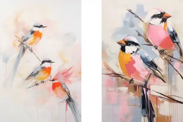 Poster Păsări cocoțate pe ramuri, culori pastelate moi, fundal deschis cu nuanțe de roz și alb Nr d00658