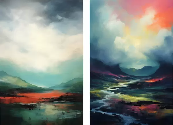 Poster Peisaj abstract cu nori în tonuri de turcoaz și roșu d00691