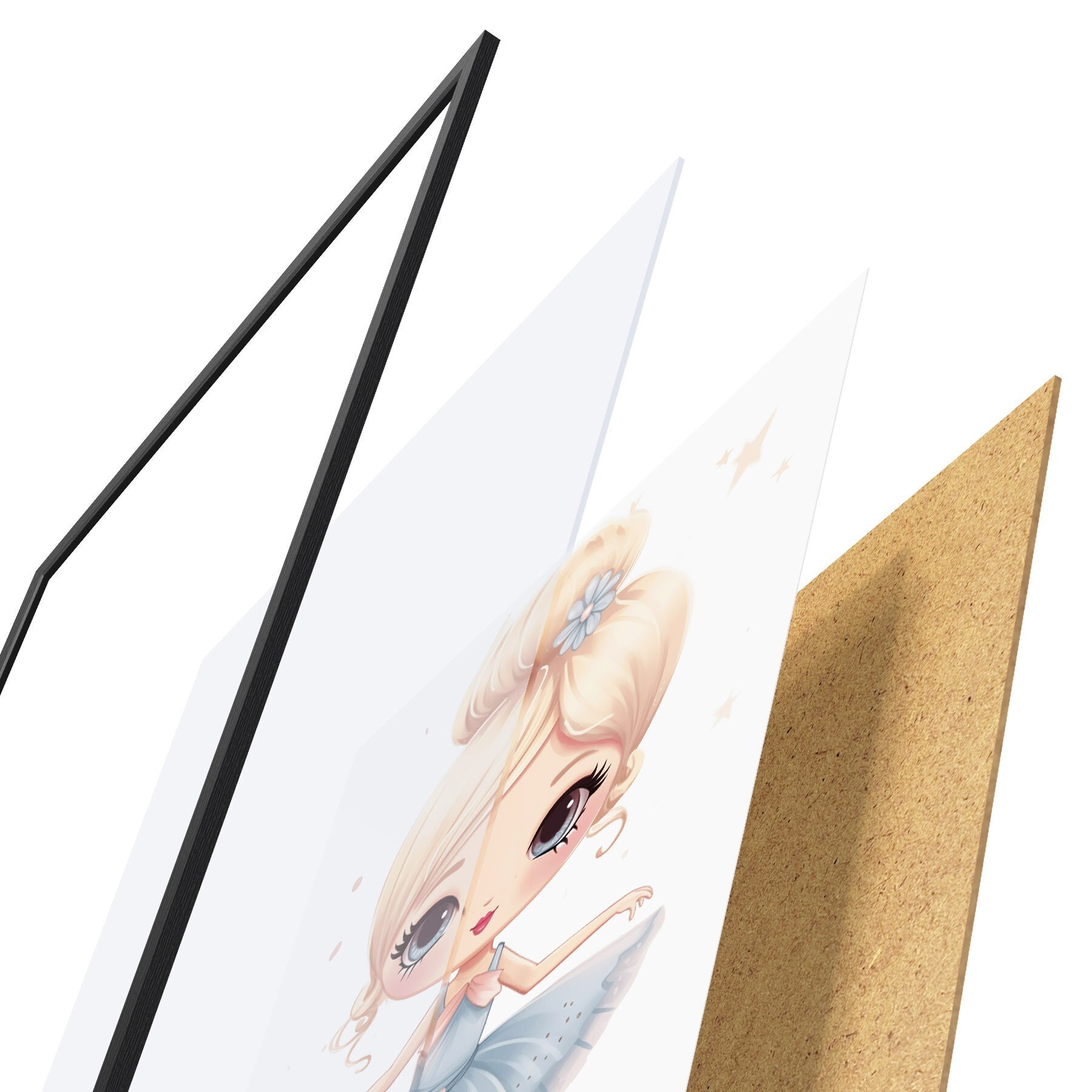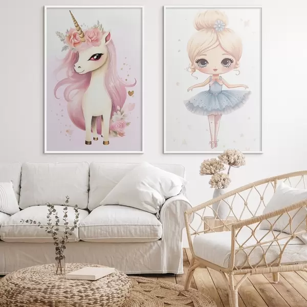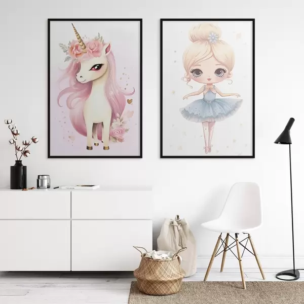 Poster Păpușă balerină în rochie albastră și unicorn cu coamă roz d00692