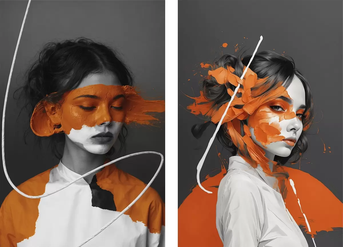 Poster Portrete de fete cu tușe abstracte portocalii Nr d00693