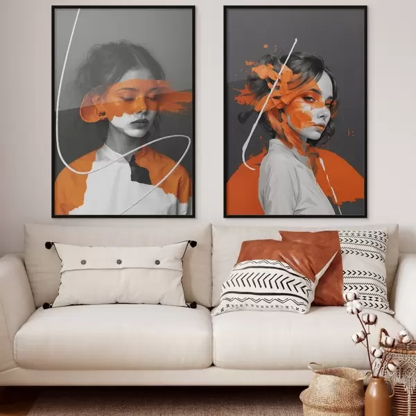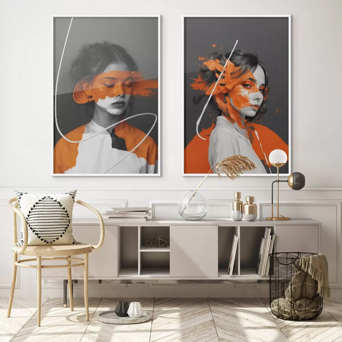 Poster Portrete de fete cu tușe abstracte portocalii d00693