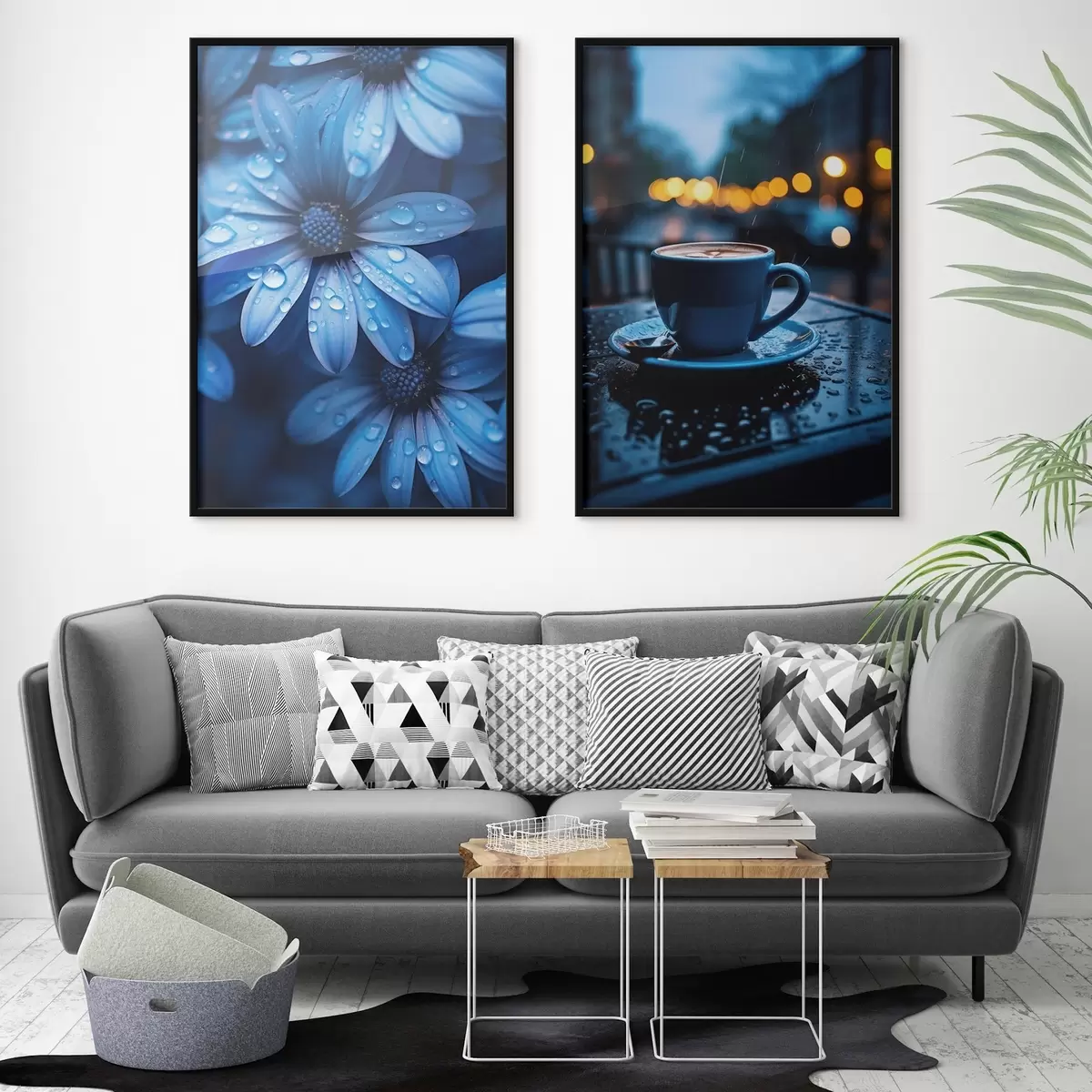 Poster Flori albastre cu picături de apă și o ceașcă de cafea în ploaie d00694