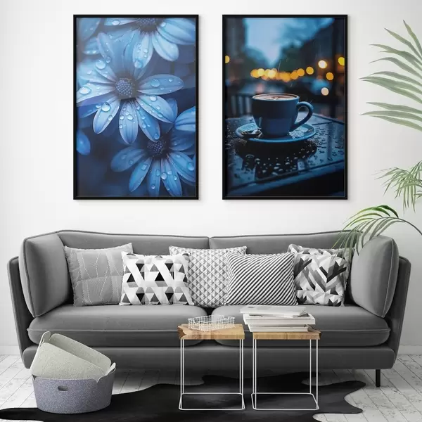 Poster Flori albastre cu picături de apă și o ceașcă de cafea în ploaie Nr d00694